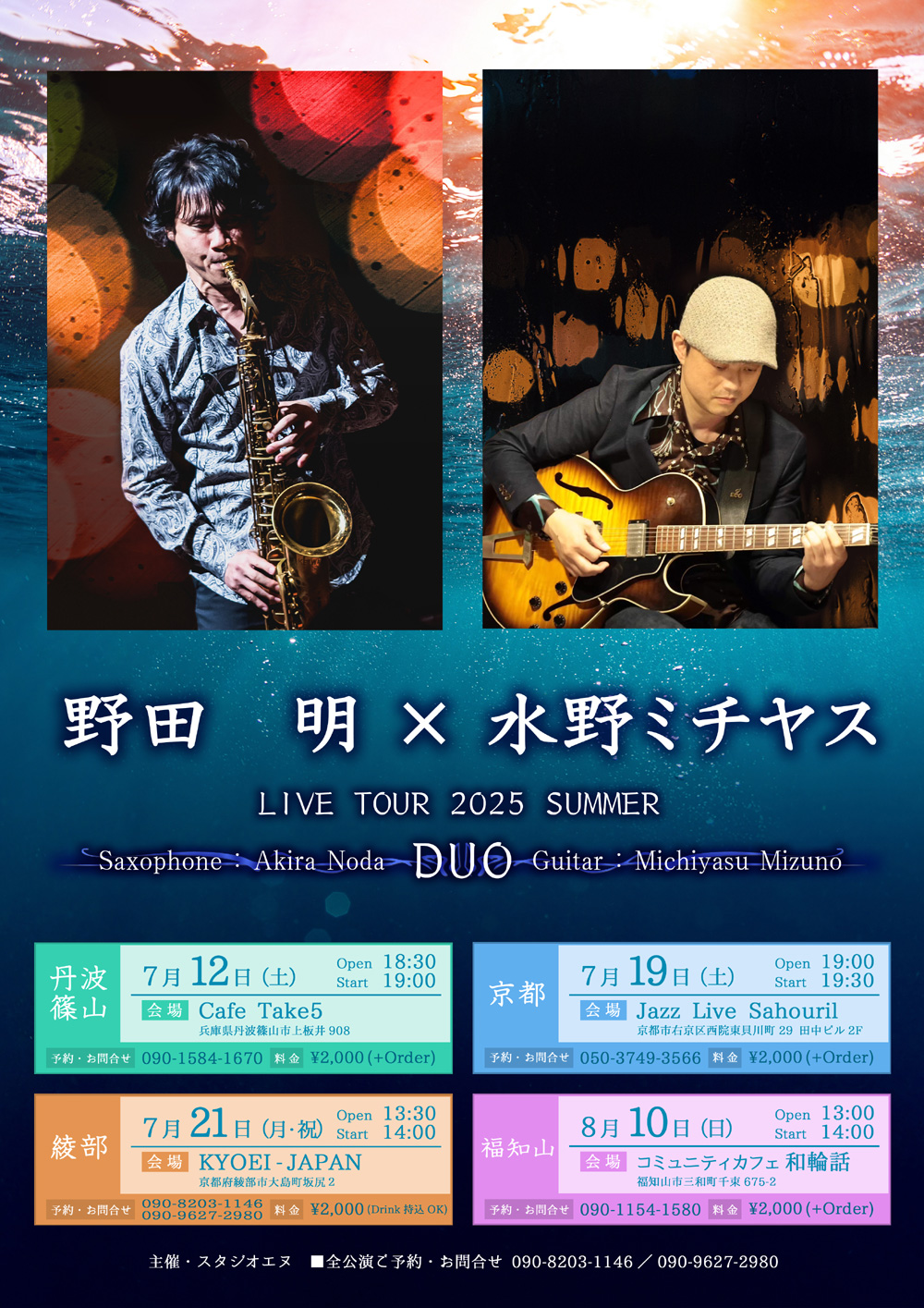 野田明×水野ミチヤス DUO LIVE TOUR 2025 SUMMER ■7月12日(土) 丹波篠山 Cafe Take5 ■ 7月19日(土) 京都 Jazz Live Sahouril ■ 7月21日(月・祝) 綾部 KYOEI-JAPAN ■ 8月10日(日) 福知山 コミュニティカフェ和輪話